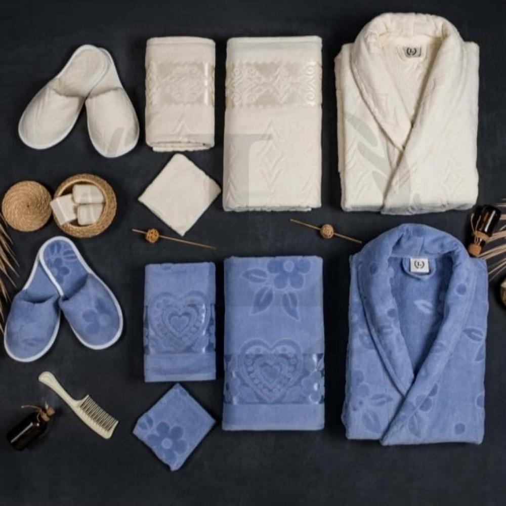هذا الطقم المصنوع بعناية يضمن الراحة الكاملة بعد الاستحمام، فهو يجمع كل ما يحتاجه العروسان من أرواب ومناشف متكاملة. الجودة القطنية تمنح ملمساً ناعماً وامتصاصاً عالياً للماء، مما يجعل التجربة أكثر تميزاً.